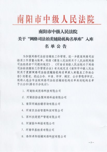 2025年1月入圍南陽市中級法院“網絡司法拍賣輔助機構名單庫”